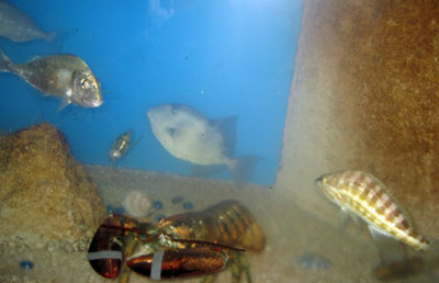 Arriba, imagen del acuario del Club. En la imagen, serrano, bogavante, pez ballesta y dorada