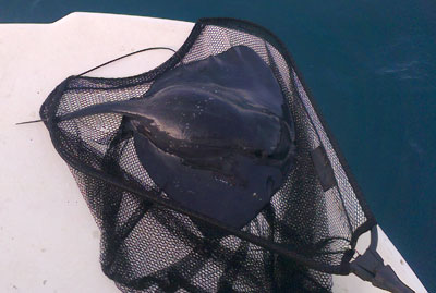La pieza mas destacable por la emocionante lucha que ofreció, fue un águila marina de 3 o 4 kilos de peso, que ni siquiera quisimos subirla a bordo, dado su temible aguijón . Desde la bañera le liberamos al mar |