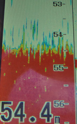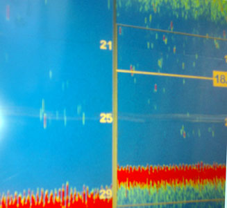 A la segunda sardina que le largamos, pasó por encima volando...y ni caso. Eso creo que hicieron también las sorelas y jureles que veímos en la sonda, alguna de las cuales entraron al langostino congelado, pero.. sin matarse a comer , por lo que a las once y cuarto estábamos ya en el puerto |
