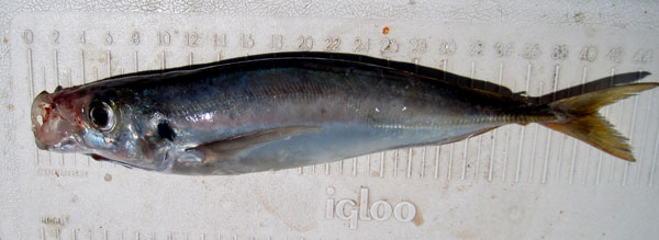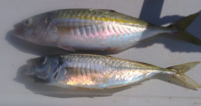 Arriba sorela o decapterus ronchus, (con su caracterÍstica banda amarilla) , recien salida del agua, y su cuerpo mas rechoncho.Bajo jurel blanco o trachurus mediterraneus