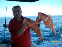 | Bonita foto comparativa de un cabracho o gallina ( con su típica mancha negra en la aleta dorsal ) y un pollo (llamada así localmente la gallineta o helicolenus dactylopterus) , que no tiene esa mancha . Esta pesca fue hecha a bordo del Tormenta I en 130 m. de sonda . Foto remitido por " el tio Juan" |