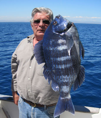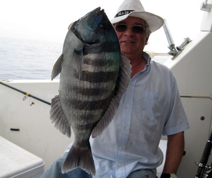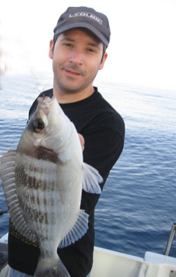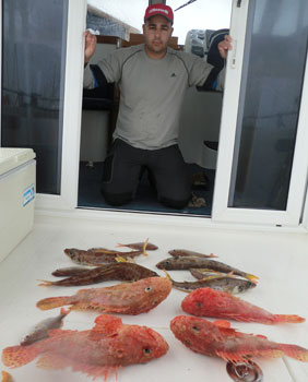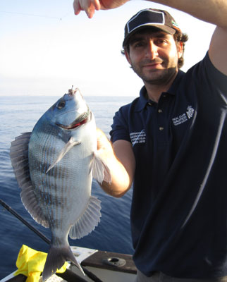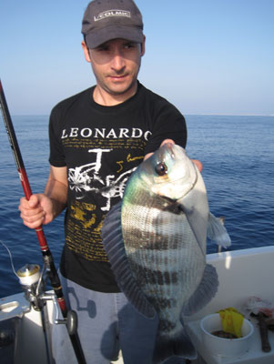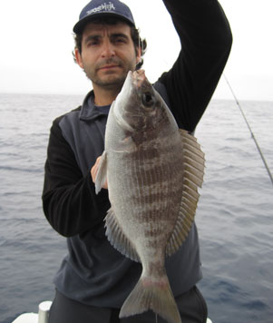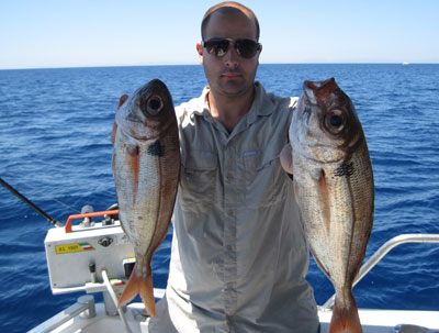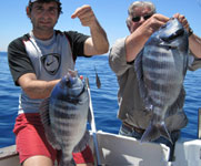 Arriba, salabrando una buena chopa. A la derecha el patrón del Avizor con una de las capturas |
