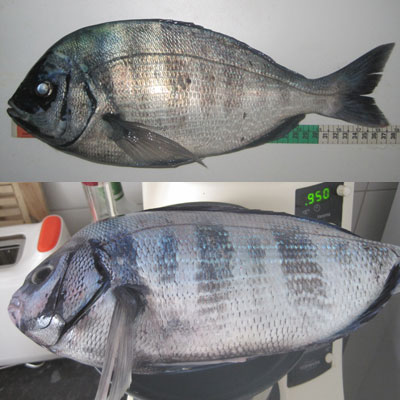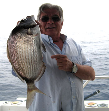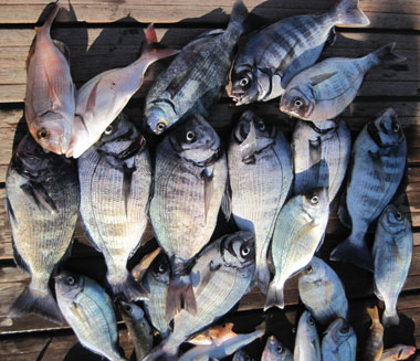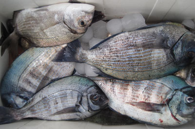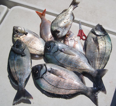 | Bajo, un buen pargo y una selección de la pesca del día : Pargos en torno al medio kilo y chopas de 800 a 1.200 gr. |