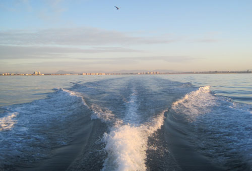 Navegando hacia el pesquero. A la salida del sol ya había calma. Al fondo queda Torrevieja