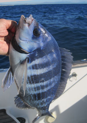 .Tampoco fue mal. Eso si, el viento cambiante , la mar de de levante, y el poco de corriente hizo que no fuéramos muy precisos en el fondeo, por lo que hasta las 10 -había salido a las 7, 30,- no subíamos nuestra primera chopa. Y es que éstas se encuentran preferentemente en las partes mas altas de los fondos rocosos, por lo que hay que afinar bastante en el fondeo, si se trata de pequeños arrecifes submarinos a profundidades medias