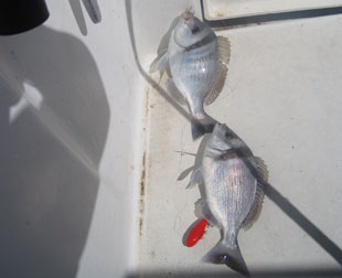 | Hicimos dos fondeadas. Una de ellas buscando chopas y pargos, y la segunda , ya pasado el mediodía , en busca de las grandes chopas macho a pocas millas del puerto. Resultó un excelente día de pesca en el que no fueron raros los dobletes como los que presento bajo.El de bajo, a la izda, de chopas hembras de 300 a 400 gramos y el de la derecha, un excepional doblete, logrado por el patrón, J.M. Medina, de dos chopas machos, azules, de mas de un kilo cada una .Pulse imagen para ampliar