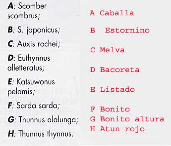| Esquema muy didáctico de los Escómbridos de las aguas españolas tomado del estupendo libro de J.Corvera, Ana Sabatés y Antoni García : PECES DE MAR DE LA PENINSULA IBÉRICA |
