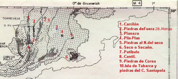 l. y 37º53’00 l. Se encuentran a unas 9 millas al E. de Torrevieja.