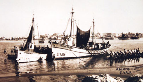 Traiñas desenmallando en el talud existente junto al comienzo del puerto Año 1950. Una de ellas es el Alejo Valero