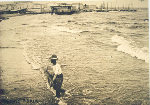 Desembarco de un atún antes de la existencia de muelle del Turbio en el playón que existía en donde hoy está el Club.Al fondo barcos fondeados en el llamado" puerto piojo". Comienzos del S. XX