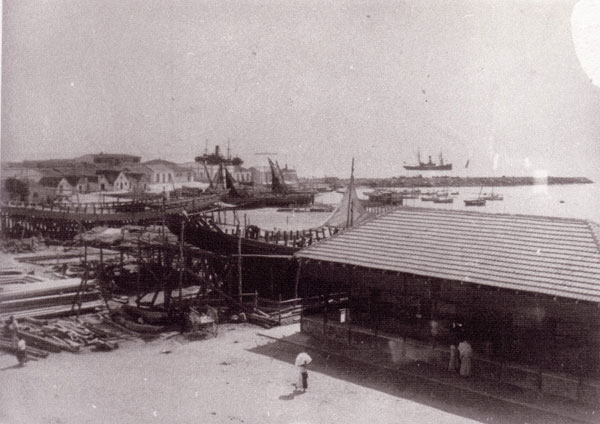 Comienzos de siglo XX: Pescadería . Astillero y playa. Al fondo Dique de levante en construcción