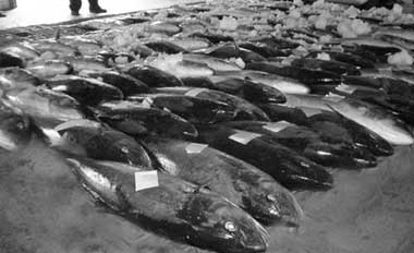 Por desgracia, las siguiente noches, barcos profesionales de Torrevieja, enterados de la presencia de lechas sobre este pecio, las cercaron con la red, una vez concentradas a la luz de las mamparras e hicieron una matanza de mas de una tonelada de lechas como las que se ve en la foto de mas abajo