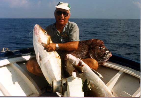 Una mañana de lujo: dos seriolas de 24 y 20 kilos y una sama macho de 14. A bordo Rate, mi hermano, Manolo M.Galiano que se hizo con dos de la piezas y el autor que consiguió la lecha de 20 kg . La foto , en la proa del Chambel.