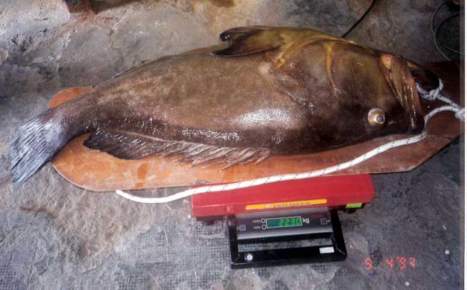 Mero de 20 kilos , récord del Club, pescado en 1993 a bordo del Mistral por mi hermano , utilizando una enorme boga viva En la báscula del Clubse puso una tabla para ayudar a pesarlo. Descontando tabla y cabo su peso exacto fue de 20 kg Arriba: En la foto de la derecha se aprecia un plomo y un aparejo colgando de la boca del enorme mero. Resulta que unos días antes había perdido, con un gran pescado, precisamente ese aparejo. Un quitavueltas deficiente ( o un despiste al cerrarlo) hizo que este hermoso animal se escapara en esa primera ocasión. |
