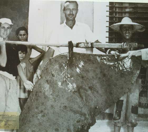 Genovés con una raya mariposa o manta de 39 kg, pescada en Lo Ferris cerca de Torrevieja