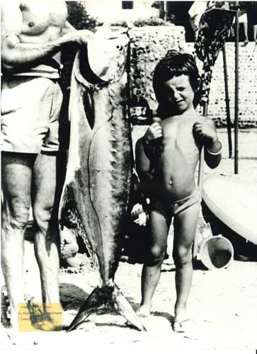Uno de las muchos palometones pescados por Henri Alcántara ( el francés) junto a la escollera del puerto. Pesó 18 kg. Agosto 1980