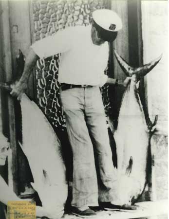 A la izda Alcántara con dos palometones de 22 y 25 kg pescadas en 1982. Las pescaba con flucha o línea de mano, desde una pequeña chalupa de plastico que fondeaba por fuera de la escollera. Cuando el animal era tan grande que no podía dominarlo, se soltaba del fondeo y se dejaba remolcar por el palometón , hasta que éste se agotaba. Asi pescó, en un verano, una docena larga de grandes palometones.