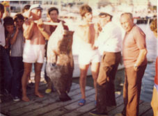| En aquellos años se podían hacer buenas pesqueras hasta desde la puerta de la casa, en la playa de los Náufragos. Vea si no, estas dos fotos de aquellos años. Una buena dorada y un llobarro pescados por Rogel un buen pescador de Orihuela, empleando simplemente pata de pulpo. |