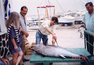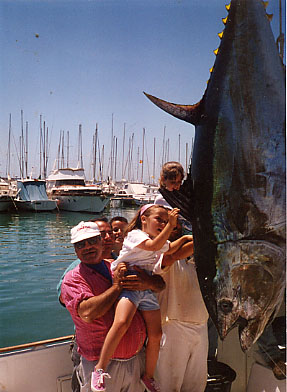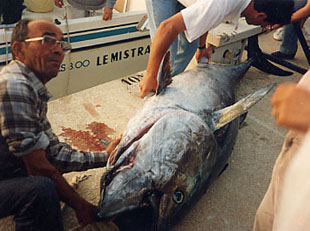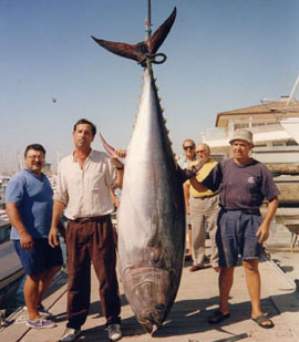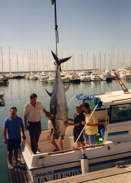Para ver ampliadas las fotos de otras capturas haga click sobre las pequeñas imágenes Al año siguiente, en 1995, numerosos barcos profeionales de pequeñas esloras procedentes de Aguilas, Mazarrón , Denia etc se concentraron en Torrevieja consiguiendo capturas importantes de atun durante los meses de invierno y primavera, pescándolos a 24 millas de Torrevieja cerca de los llamados “Candeleros” Los barcos deportivos de este Club lográbamos también ese año unos 30 grandes atunes. Es entonces cuando José de la "Ilusión" pesca un gran atún aún record en Torrevieja, de 340 kilos.