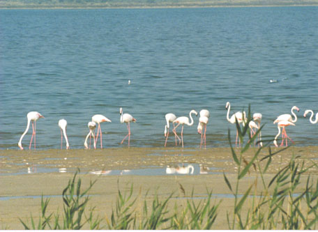 precisamente los flamencos), y de la presencia de muchas aves acuáticas,
