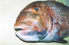 ![]() Sama o Dentex gibosus hembra. Los machos tienen la joroba nucal mucho mas grande |
