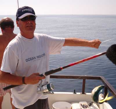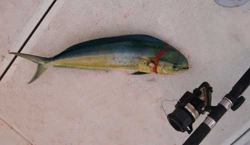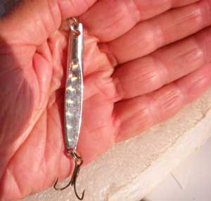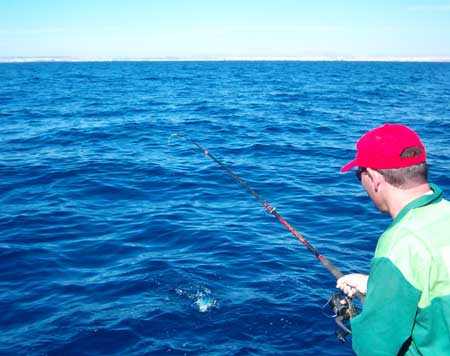 Un vez lanzado, dejo que se hunda el artificial unos 10 o 15 m y empiezo la recuperación no muy rápida intercalando un par de tirones bruscos cada cada 3 o 4 segundos, hasta tener el artificial al costado del barco. No es muy raro que durante la recogida tengamos 2 o 3 ataques bruscos antes de clavar definitivamente una lampuga. Su defensa es espectacular, dando saltos o haciendo cambios de dirección bruscos casi en superficie, a veces cortando la superficie del mar con su enhiesta aleta dorsal