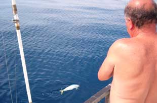 Es corriente que otras lampugas acompañen a esta que va prendida en el anzuelo, siendo esta circunstancia aprovechada po los demas de a bordo que les largarán a las que se acercan unas pequeñas sardinas enganchadas en sendos aparejos. Si vienen un par de ellas al menos, la picada está asegurada.
