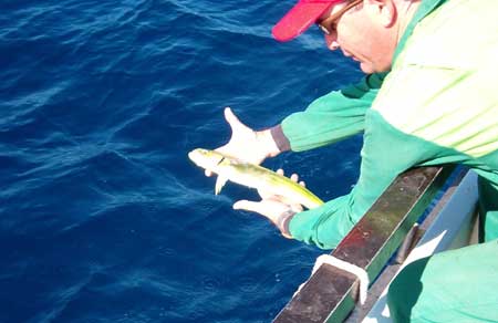 la pesca y suelta especialmente de los ejemplares menores que no han sido muy traumatizados por la potera del artificial.
