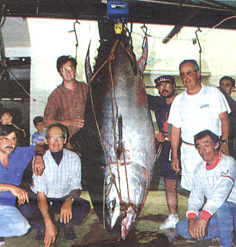 Los primeros claros de aquel día de primavera iluminaban ya los altos mástiles de los veleros del puerto de Altea. Francisco Lledó acompañado de 5 amigos, se dirigió hacia su barco, el “Arce”, un precioso barco a vela con el que la semana anterior había logrado un enorme atún que dio en la bascula 200 kilos. Llevaban de cebo varias cajas de sardina y unas cuantas caballas. Pescaban el atún mediante línea de mano. Para ello tenían adujados en un gran capazo 1500 m. de cordel fino de nylon, provisto de un terminal de grueso sedal del 200 en el que había empatillado un gran anzuelo del 12/0. Salieron del puerto y navegaron rumbo hacia el este y cuando estaban a unas 25 millas de su puerto base, frente al cabo de S. Antonio, detuvieron el barco y empezaron a brumear, calando al mismo tiempo su línea de mano. El tiempo transcurría lentamente y no percibían en la sonda ninguna señal que indicara la presencia del atún. Pese a ello estaban ilusionados y llenos de esperanza, recordando las fuertes emociones vividas la semana anterior con aquel enorme atún. El barco derivaba lentamente mecido por la marejadilla, y el rastro de sardinas se prolongaba ya varias millas . De pronto hacia las tres de la tarde, la línea empieza a salir al principio despacio, pero a continuación y con un suave silbido salen en un instante mas de 1200 metros de línea. -¡Ya lo tenemos- exclama alguien! Pero nadie de momento coge la línea ya que saben que es muy peligroso, durante esa rápida huída del atún, tratar de frenarlo. Una espira de la línea puede liarse en el brazo y tirar un hombre al mar. Es Lledó el que al disminuir a velocidad de salida, coge resueltamente el sedal y da un fuerte tirón para clavar. El atún inicia otra carrera que esta vez es frenada con la ayuda de los guantes que previamente se ha puesto. Y entonces empieza una prolongada lucha contra un poderoso animal que tira como un caballo y al que apenas se le puede cobrar unos pocos metros de los 1.200 que ha sacado. Se organizan de tal modo que uno se pone a timón, una vez encendido el motor, otro frena y tira de la línea y otro, y esto es muy importante, aduja cuidadosamente en el capazo el cabo cobrado, para que nadie lo pise en cubierta, evitando así un accidente. Los demás, esperando su turno descansan en la bañera. A las 8 de la tarde, cinco horas después, una espesa niebla se abate sobre el mar al tiempo que cerca del barco escuchan un chapoteo en el agua que se acerca y les rodea. ¡Eran unos monstruosos atunes probablemente compañeros del que estaba enganchado! “La visión de todos aquellos animales, con la niebla, y el sol a punto de desaparecer, era sobrecogedora. Algo impresionante”- confiesa Lledó. A la una de la madrugada, después de 10 horas de una lucha épica, la línea se lía por debajo del barco, probablemente en la pala del timón o la hélice. No están dispuestos a perder el atún por lo que uno de ellos, el mas decidido, coge una linterna sumergible, se ata con un cabo al barco y se sumerge junto a la popa. Tiene la suerte de que el atún no tira en ese momento con violencia y no hay mas que una espira en torno al timón, por lo que puede liberar la línea. Poco a poco puede izar el atún que ahora está a muchos metros por debajo del barco. Lo suben con dificultad dado su gran peso y cuando está al costado del barco le clavan un bichero. El atún se revuelve y agita el mar con su poderosa cola. En ese instante el terminal se rompe . El atún solo esta enganchado con el bichero y ellos se sienten intranquilos pues con una sacudida puede zafarse del gancho y perderlo. ¡ Es gigantesco! Ninguno de ellos ha visto jamás un atún de estas proporciones Aunque el animal estaba aún vivo, no dudan en tirarse de nuevo al agua y con habilidad le meten por las agallas un cabo tieso que los de cubierta atrapan al sobresalir por la boca. Hacen firme los dos cabos en el barco, y por fin respiran tranquilos. Agotados y locos de alegría se sientan en la bañera. Eran las tres de la madrugada Ante la imposibilidad que izar el atún a cubierta, inician un lento remolque camino de Altea donde arriban 10 horas después, a la una del mediodía del domingo. !29 horas después de su partida! En el puerto deportivo desembarcan con gran expectación el gigantesco atún que dio en la báscula 425 kilos y midió 3 metros ¡Toda una proeza y un verdadero récord! INICIO