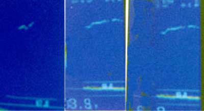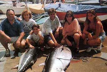 Aquel lejano día de primavera, un amigo profesional, dedicado a la pesca del pez espada, había detectado la presencia de atunes cerca de la costa de Torrevieja. Con esta valiosa información, al día siguiente, antes de que amaneciera, estábamos ya en la zona indicada. De vez en cuando y con un intervalo de unos 50 metros tirábamos una alacha haciendo rastro hasta llegar al sitio señalado en el Plotter según las coordenadas que nos habían indicado. Ibamos atentos mirando hacia todas las direcciones pero especialmente a popa, por si se veía esa señal característica que indica la presencia del atún cerca de la superficie. Consiste en una especie de borbotón en la cara del agua, provocado por la poderosa aleta caudal del atún cuando atrapa una alacha cerca de la superficie. Al llegar al punto elegido, dejamos el barco a la deriva. Pusimos en una de las cañas una alacha y en el terminal de la otra, encarnamos del lomo, junto a la cabeza, una salpa viva de unos 300 gr. que dejamos ir mas al fondo con ayuda de un plomo. Con aquellas (y también con lisas) hemos conseguido varios grandes atunes. Brumeamos arrojando trozos de alacha y de vez en cuando alachas enteras. A los pocos minutos sonó en nuestra sonda el pitido intermitente de la alarma del pescado. !Había un atún bajo el barco en 20 m. de agua! Emoción a bordo y un rápido reparto de cometidos para que cada uno sepa lo que hacer en el momento adecuado. Seguramente nos había seguido mientras navegábamos. Hubo entonces una espera tensa, pues sabíamos que en cualquier momento podía producirse la picada. Reforzamos el brumeo para hacer subir el atún; procuramos colocar uno de los cebos al nivel que nos señala la sonda, pero el tiempo pasaba y ni se veía el atún en superficie ni quería picar. Sabíamos que estaba allí pues de vez en cuando saltaba la alarma. Alguien a bordo empezó a dudar y pensando que las señales de la sonda seriían de otra clase de pescado. Pero los demás sabíamos que era“él” y que seguía allí