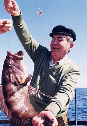 Yo clavé una buena pieza que me divirtió inicialmente con su bravura. Luego comprobé que se comportaba como un congrio, dejádose subir pesadamente para de vez en cuando irse con fuerza hacia el fondo. Resultó ser una preciosa morena de 2 kilos que desde el fondo del salabre nos miraba con sus ojos iracundos y su boca amenazadora. -!Este es muy gordo! -aseguró. Inicialmente lo trató con dureza para impedir que el animal se refugiase dentro del pecio. Luego lo vi trabajarlo con calma y maestría cediendo a intervalos metros de línea cuando el bicho se iba inconteniblemente hacia el fondo. Poco a poco lo fue elevando, sin prisas pero continuadamente Sebastián y yo retiramos rápidamentre nuestras líneas para no estorbar la faena y luego nos pusimos a su lado, uno con el salabre y yo con el bichero, por si se trataba de un gran congrio. Al poco lo vimos subir. Nos quedamos electrizados. Una gran cherna se debatía aún furiosa del extremo del sedal mostrando una gran boca abierta. Sebastián intentó meterla en el salabre, pero al ver yo su tamaño, con un decidido tirón la enganché con el bichero. Una gran alegría nos colmó a todos. Antonio, aunque veterano en estas lides, estaba que no cabía en sí de gozo.