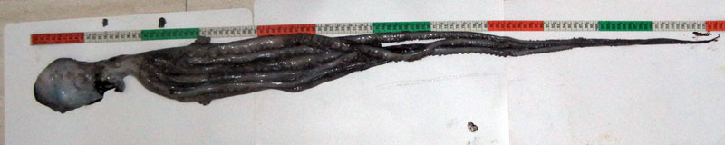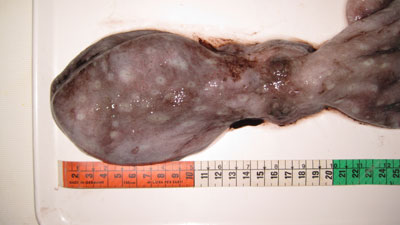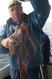| El pulpo de patas largas o pulpón pertenece al género de los octopus como el pulpo o octopus vulgaris . Se diferencia de él, por sus larguísimas patas y por por la presencia en su cuerpo y patas de color rojizo, de manchitas blancas fosforescentes . Tiene doble fila de ventosas como el octopus vulgaris. En la literatura consultada se señala que esta variedad de pulpo tiene un manto o cuerpo de unos 13 a 15 cm de talla media , y un peso medio de 400 gr. Vea entre otras (http://doris.ffessm.fr/fiche2.asp?fiche_numero=848) y Wikipedia Nuestro ejemplar pesó 880 gr. y midió 16 cm de manto (medido como es preceptivo, desde la punta de la cabeza hasta los ojos) siendo su talla total de 123 cm. lo que quiere decir que es de los ejemplares mas grandes controlados . Ver mas bajo, detalle de su medida. Este era un ejemplar con gonadas de macho. Me llamó la atención, con relación al octopus vulgaris, que su embudo propulsor era muy largo y sobresaliente del manto y que éste estaba tabicado en su parte posterior . Vive en aguas cálidas del Mediterráneo, Mar Rojo, y en las aguas costeras atlánticas de Africa. Es mucho mas raro que el pulpo u octopus vulgaris y en mis mas de 70 años de pescador, es la primera vez que lo he visto. Lo mismo le ocurre al veterano buceador (y ahora pescador sobre barco) Jaime Martínez, que es el que lo lo pescó, a bordo del GINTONIC, con un volantín, utilizando de cebo un cangrejo ermitaño. El pulpón tiene hábitos nocturnos y vive en fondos rocosos y de posidonias, desde aguas someras hasta una profundidad de 40 m. Nosotros los pescamos en 44 m. de sonda frente al Pilar de la Horadada (Alicante). Vea otras fotos del mismo ejemplar |