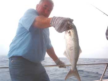 Su método consiste en dejar la cucharilla o jig hasta casi el fondo (jigging) o lanzarla unos metros dejando que se hunda un poco (spinning). Seguidamente da un par de tirones muy fuertes y seguidos, levantando con brusquedad la puntera de la caña, dando a continuación una o dos vueltas a la manivela del carrete, repitiendo los tirones y cobrando alternativamente línea hasta que aflore el señuelo. La finalidad es imitar la brusca huida de un pececillo a la vista de su depredador o llamar la atención del mismo al percibir éste las vibraciones del señuelo al agitarse, o al ver los destellos plateados que produce la pulida superficie del mismo. A mi lado estaba un veterano pescador profesional, Rafael “el del Meteoro”, ahora apasionado por la pesca deportiva. Hace unos 45 años fue uno de mis maestros en la pesca sobre barco y del cual aprendí “señas” –enfilaciones- de pesqueros que aún conservo y pesco.