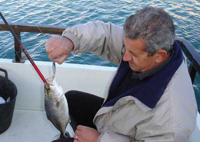 A él le gusta pescar con línea de mano, dando frecuentes tirones a la misma al tiempo que la va recuperando poco a poco. Me llamó la atención su eficaz y artesanal señuelo. Era simplemente un pequeño cilindro de plomo de unos 8 cm de largo y uno de grueso, en uno de cuyos extremos había una anilla y en el otro una potera cuya pata estaba soldada en el interior del plomo. Para darle brillo raspaba con una navaja su superficie. Resultó que su sencillísimo artificial, en sus manos tenía casi la misma eficacia que nuestros sofisticados y caros” jigs ” o cucharillas plomadas, clavando en esta ocasión él, una de las mejores piezas de la jornada.