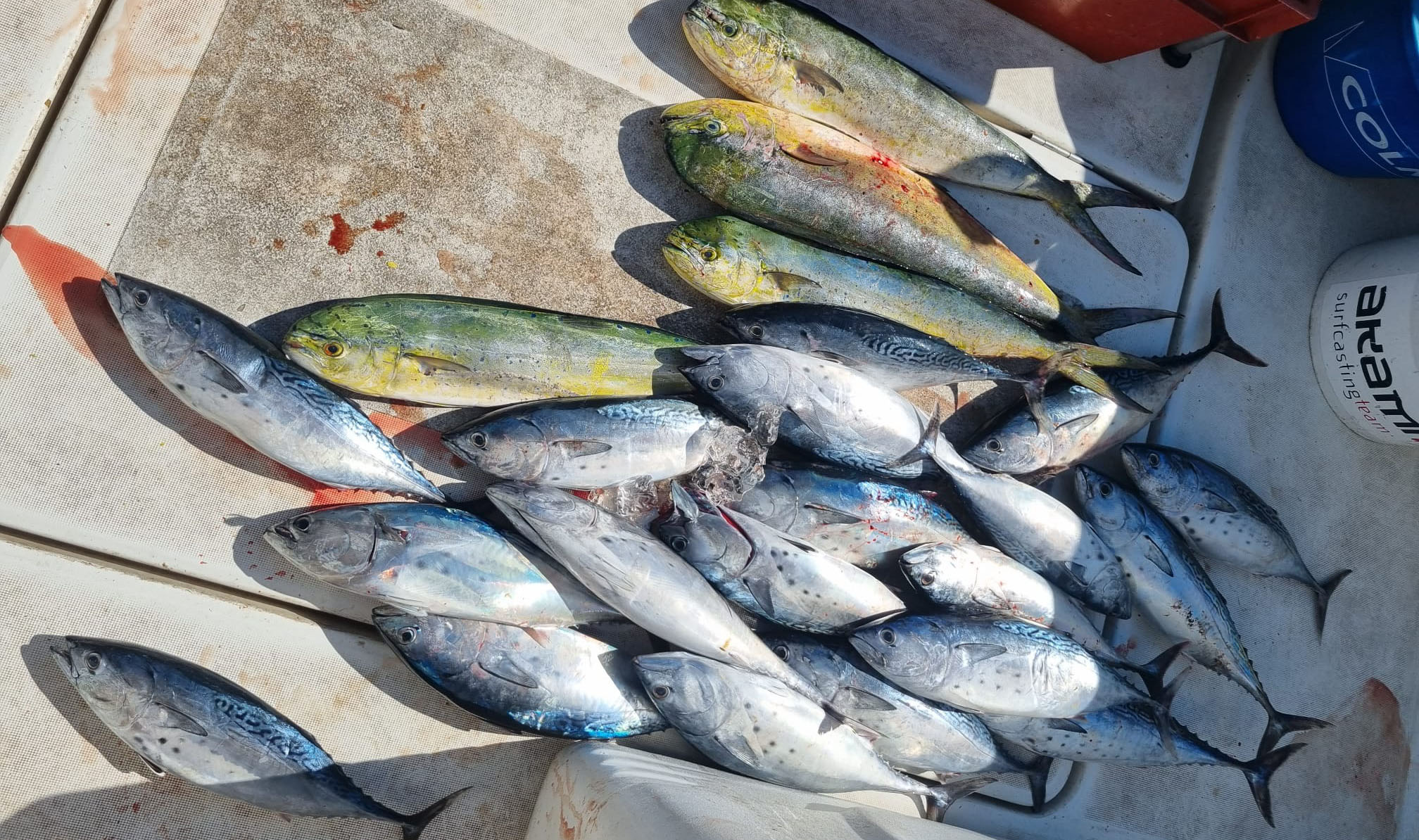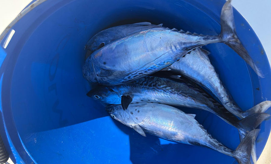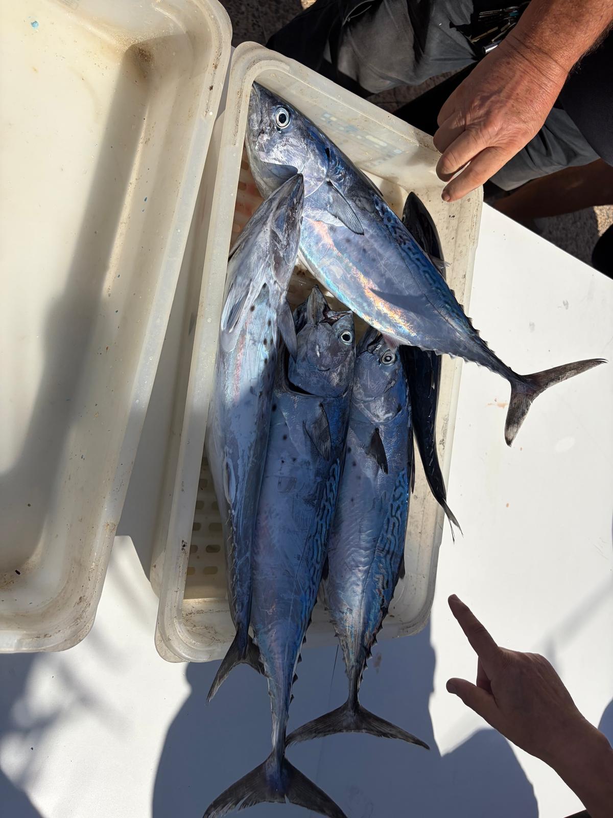 de las capturas las obtuvimos en ese lugar querencioso en el que abundaban las BACORETAS de buen tamaño (superior al kilo y 40 cm) y algún que otro ATÚN que apenas sobrepasaba el medio kilo. En este sentido es importante reseñar que la consabida presencia de los prohibidos atunes nos llevó a realizar un montaje (en 3 de las 4 cañas) con un señuelo de fabricación propia (pulpito de cabeza nacarada) dispuesto tras un excitador tipo “avión”. Según nuestra experiencia, las bacoretas tienen especial querencia por ese señuelo (de color secreto), con la particularidad de que los atunes apenas muestran interés por él, discriminando