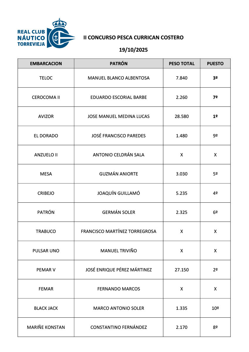 El pasado domingo 19 de octubre se celebró el II CONCURSO SOCIAL DE CURRICÁN COSTERO del RCNT, entre las 7:00 y las 14:00. Aunque no se trata de un concurso nuevo, sí es una modalidad que en el RCNT no existen demasiados antecedentes, por ser un club mas enfocado en la pesca de chambel y embarcación fondeada. En palabras del vocal de pesca del RCNT, Enrique Pérez (patrón del “PEMAR V”), ha sido un éxito de participación al concurrir 14 embarcaciones. Una cifra que bastantes años atrás era habitual, pero que en los últimos años se había reducido considerablemente consecuencia de diversos factores como el progresivo agotamiento de nuestros caladeros y el elevado precio del combustible. Es una lástima que, en líneas generales fuera un día con escasa actividad de pescado, si bien, algunas de las embarcaciones participantes logramos dar con zonas puntuales en las que el pescado era abundante y de buen tamaño.
