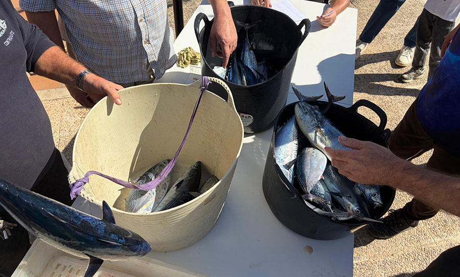 del puerto). De camino a dicha zona, solo conseguimos 3 piezas muy justas respecto al tamaño mínimo (38 cm), por lo que estaba claro cuál era nuestro destino. El plan salió bien, puesto que el pescado seguía allí y logramos (entre las 9:00 y las 13:00) un total de 23 piezas válidas (20 de ellas en esa zona),