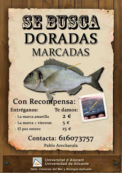 Rogamos la colaboración de todo aquel pescador que capture una dorada con una marca amarilla en el lomo, en la cual encontrará un código y un número de teléfono (el mismo que el del cartel), al que deberá de llamarnos en el menor breve tiempo posible."