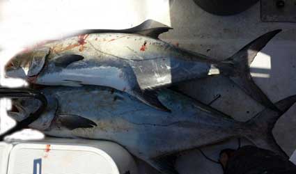| Ese día Fran Gomez Bernal pudo hacer un triple "de Campeonato", ya que aparte de esos dos preciosos palometones, clavó un tercero que, ya a punto de ganchear, rompió la potera en la que iba clavado |