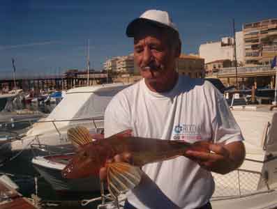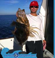 Es rara su captura en el Mediterraneo. En este caso fue pescado por Charli del RCNT y pesó 5 kilos. A la derecha ,Charli con otra buena captura una Chirriola tambien llamada Bejel, alfondega, chirriola o lucerna ( Trigla lucerna) |