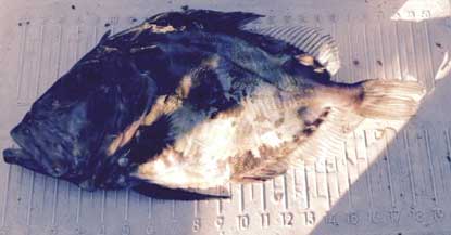 Arriba a la izquierda rodaballo ( Psetta maxima). Es un pez con cuerpo es romboidal, casi circular, con los ojos en el flanco izquierdo, llegando a alcanzar los 100 cm de longitud y 12 kg de peso, aunque lo más habitual son los 60 cm .