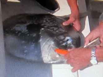 Este pez Luna, -según Miguel Cuervo-, fue arrancado del fondo del Cantil con 140 metros de agua. Creían haber enrocado y resultó ser este Luna.Cuando lo devolvieron al mar, fue rapidísimo en ir al fondo.Los vemos en superficie y parecen tontos, pero no lo son.Le atacó al curricán de fondo con calamar plomado y rapala flotante.. |
