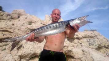 Este espetón o barracuda mediterránea fué pescado por Oscar pescando desde la costa de Benidorm.(foto remitida por Miguel Cuervo) El espetón (Sphyraena sphyraena) p uede llegar a medir hasta poco más de un metro de longitud en nuestras aguas, su color es gris verdoso a gris plomo con el vientre plateado con bandas transversales oscuras que llegan hasta la línea lateral.. Tienen dientes grandes y fuertes y una mandíbula inferior más larga que la superior Según Fish base en aguas tropicales alcanza una longitud máxima: 165 cm ; y el peso máximo publicadoes de 3,6 kg pulse imagen para ampliar.