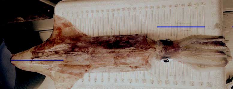 Para algunos autores, el calamar (loligo vulgaris), alcanza un tamaño máximo de manto de 55 cm, aunque para otros no pasa de 50. Éste medía 50,5cm como puede comprobar en la foto de la derecha, y un tamaño total (incluidos los tentáculos mas largos) de 120cm, pesando 3,5 kg.