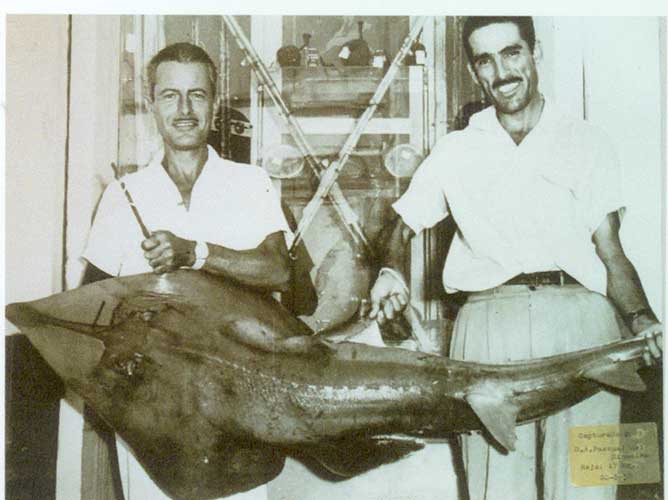 Este, que presentamos, sería probablemente uno de los mas grandes logrados en este Club. Lo fue a bordo de la embarcación PATATY patroneada por David Terrés, acompañado de su mujer Encarnita y de Luis Llor, patron del Gland. Lo hicieron pescando en el SECO o Secaño, un volcán sumergido, situado frente a Cabo de Palos, a 36 millas al SE de Torrevieja. Seguramente atacó un besugo prendido en un anzuelo y se clavó con otro de los anzuelos del aparejo.Pulse foto para ampliar
