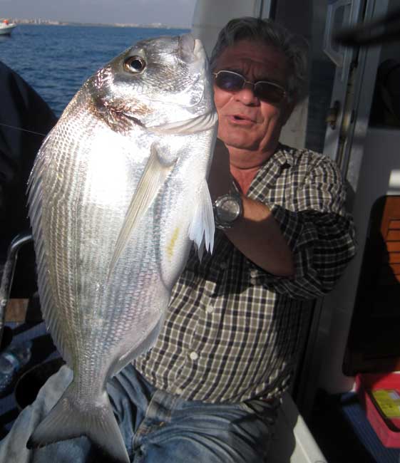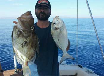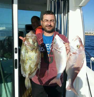 Fue pescado en unos 50 m. de sonda, igual que la dorada de cerca del kilo que presenta. Ésta ultima fue clavada utilizando lombriz tita de cebo, y el gallo Pedro con langostino