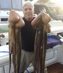 Mero dentón de 3´800 y verrugato de fango de 1´600 pescados en 100 m de sonda. A la derecha pulpos conseguidos a mediados de diciembre |