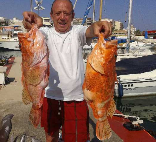 Una buena pesca con caña de mano, en 130 m. de sonda . A la izquierda, el patrón con dos gallinetas rosadas, (Scorpaena elongata) , diferentes del cabracho o gallina (Scorpaena scrofa) que habita en menos fondo. Se difrerencia de ésta, por su color mas rosado, por ser mas alargada, y por no tener mancha negra en su aleta dorsal, propios de los cabrachos o gallinas.