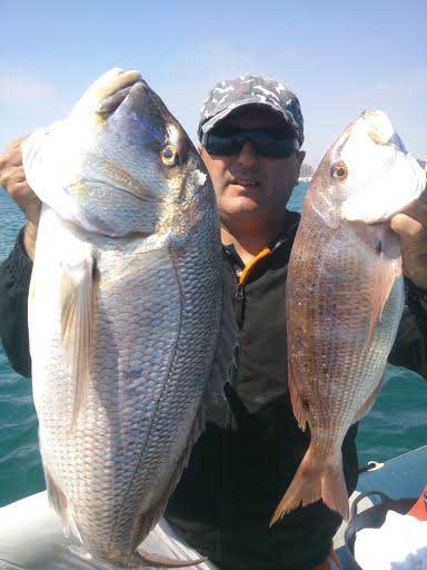 Pagel de dos kg y denton de 3, pescados recientemente a bordo de la embarcación Mis Nenas