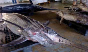 A la izquierda, 4 peces espadas capturados el dia 7 de julio por un palangrero local, de los cuales uno pesó 142 kg y otro 130 . El pez espada (Xyphias gladius), puede alcanzar los 6 metros ( de los cuales, 2 , es decir la tercera parte corresponderían a su espada). y mas de 500 kg de peso. Pero lo corriente es que en nuestras aguas no alcancen estos pesos .